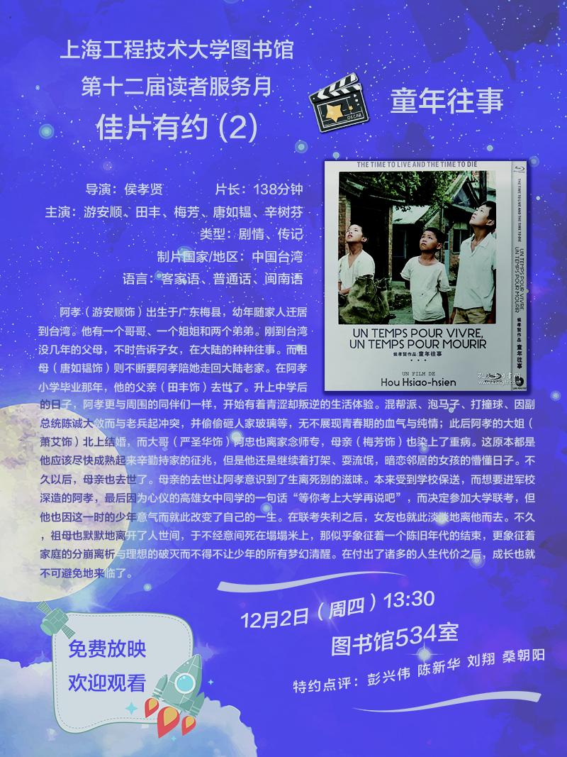 圖書館將于122月2日(周四)13:30舉辦第十二屆讀者服務月《佳片有約》活動第二期,放映影片為《童年往事》,放映地點為圖書館534室。歡迎廣大師生前來觀看。