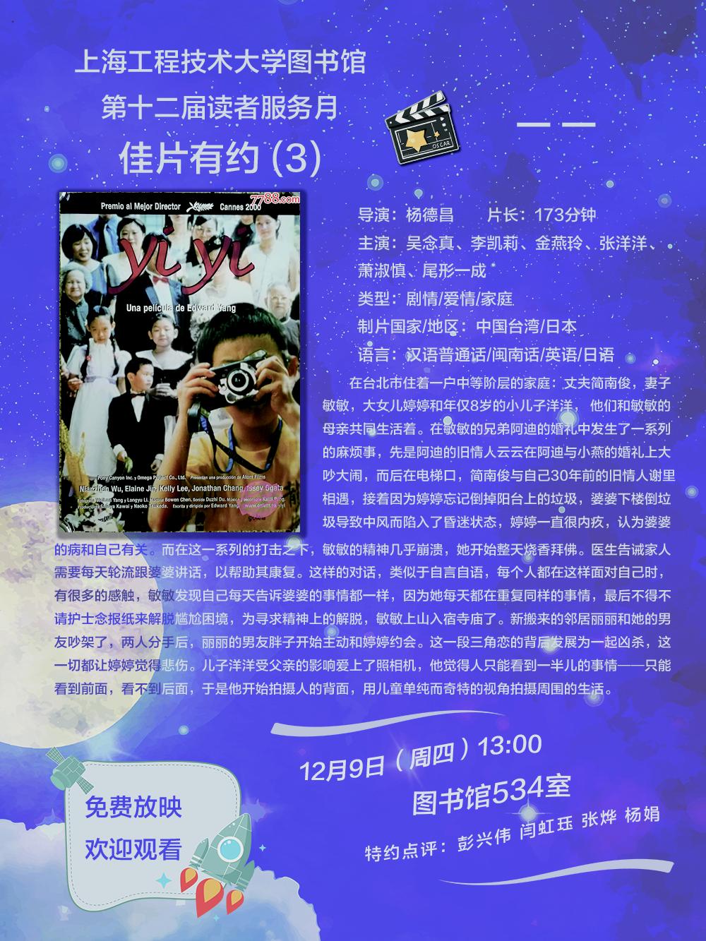 圖書館將于12月9日(周四)13:00舉辦第十二屆讀者服務月《佳片有約》活動第三期,放映影片為《一 一》,放映地點為圖書館534室。歡迎廣大師生前來觀看。